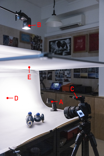 E: Light-diffusing fabric to diffuse the top light, positioned directly over the subject.