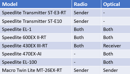 Functions supported by recent Speedlite models