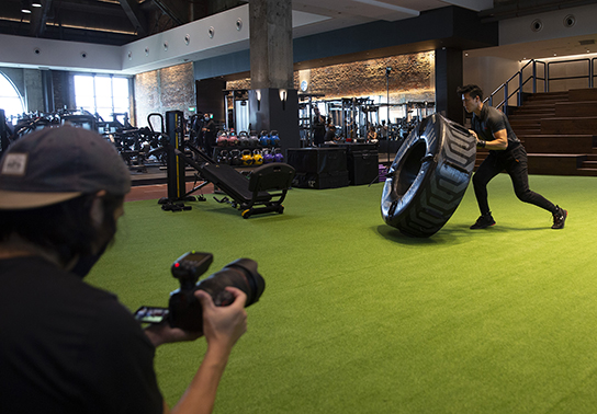 The shoot took place in a gym. There were lights streaming in from the windows on camera left, and some dim, warm mood lighting behind the subject and on the right. Overall, the location was dimly lit. The side of the subject facing the camera is in the shadow, so we would need a fill flash to brighten him up.