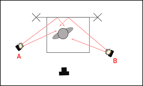 Light A is positioned slightly behind the subject and mainly lights the background on camera left. Light falls off as it travels away from the light source, so place this light closer to the backdrop.