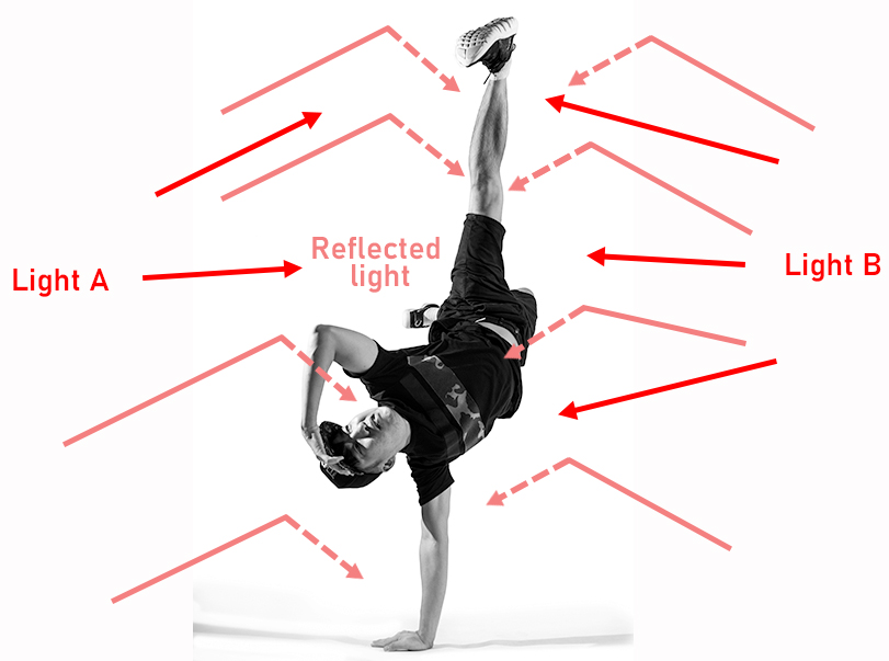 Light from Light A and Light B both fall onto the white backdrop, which acts like a giant reflector, reflecting light onto the subject’s back in a way that spills over just enough to light the edges. Shadows are created in front, but Light B is also angled in a way that it acts as fill light for the subject.