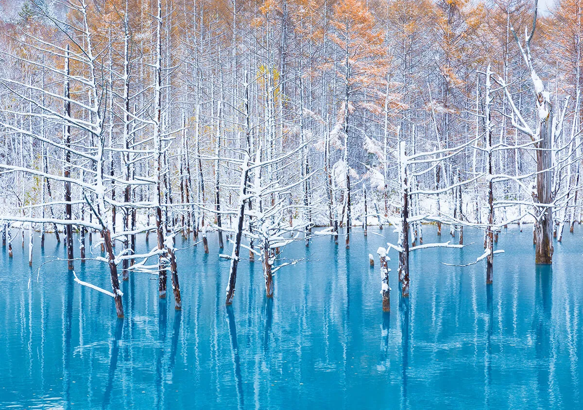 Known for its natural deep blue colour, the Blue Pond (“Aoiike”), which is located in Shirogane just outside Biei Town in Hokkaido, is beautiful at any time of the year. However, the contrast of the blue against white when it snows makes an exceptionally lovely scene.