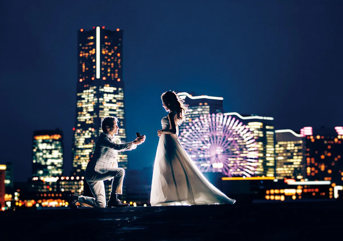 For this pre-wedding shot, the bridegroom had requested to replicate the scene of his marriage proposal. I chose a place with a gorgeous night view as the location of the shoot to add a dramatic effect to the photo.