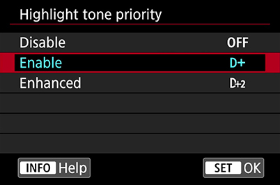 Know this: When ‘Highlight tone priority’ is turned on, the minimum ISO speed is 200 and there might be slightly more noise in dark areas. But it still is helpful—just be aware when you shoot.