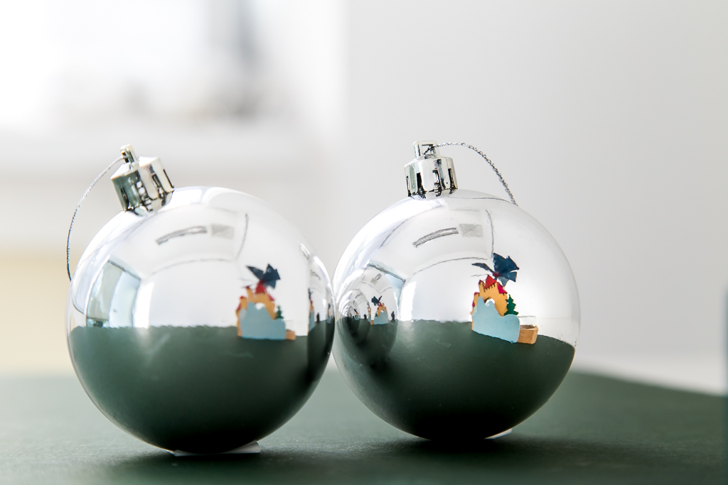 Ever heard of an infinity mirror? Use two reflective silver baubles to recreate the effect by placing them side by side. The surfaces of the baubles become a pair of parallel mirrors, thereby creating smaller reflections that recede into an infinite distance. Even though silver baubles are not as clear and reflective as an actual mirror, they give the photographer an interesting perspective and a play on space and distance.