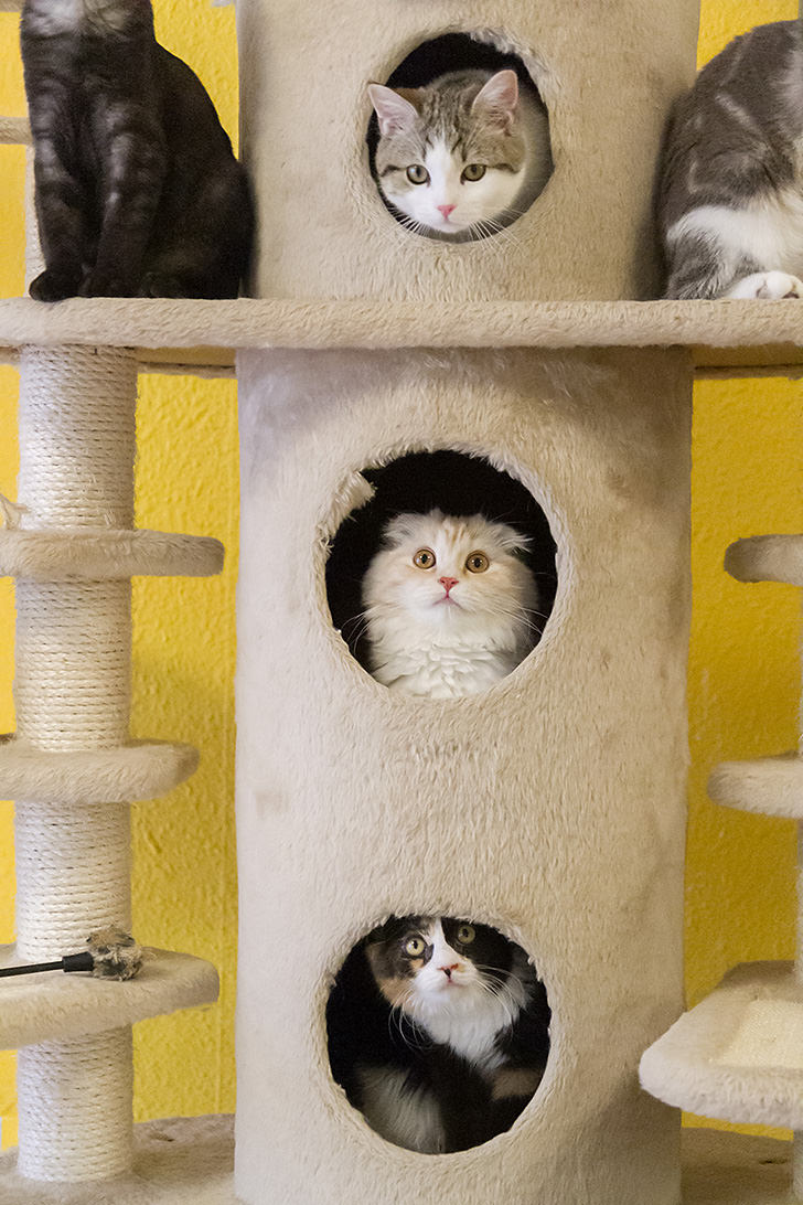 The holes of a cat tower are the best places to capture the large eyes of cats. Since the inside of the holes are dark, the eyes will look big. Capture them when their heads pop out of those holes.