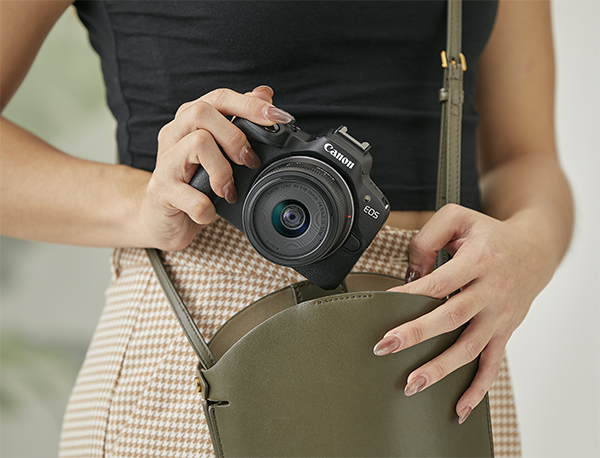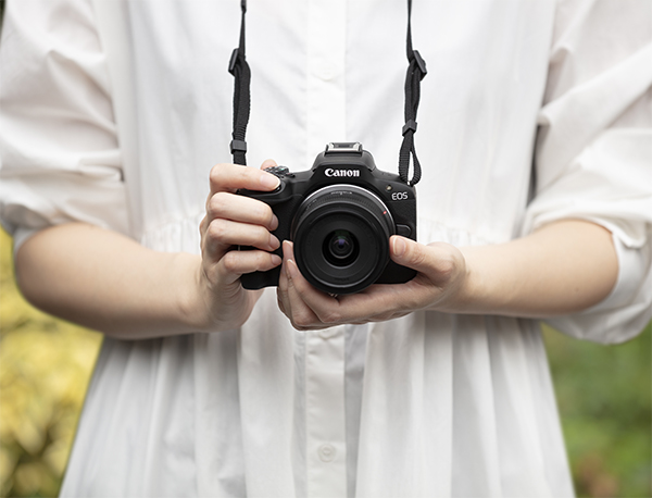 At approximately 85.5mm tall, 116.3mm wide, and 68.8mm deep, the EOS R50 easily fits into a small everyday bag with room to spare. It also weighs only 375g, so you can still travel light! It feels comfortable on a strap around your neck, too—all ready to shoot. And because it’s compact, it’s discreet: perfect for street and candid photography.