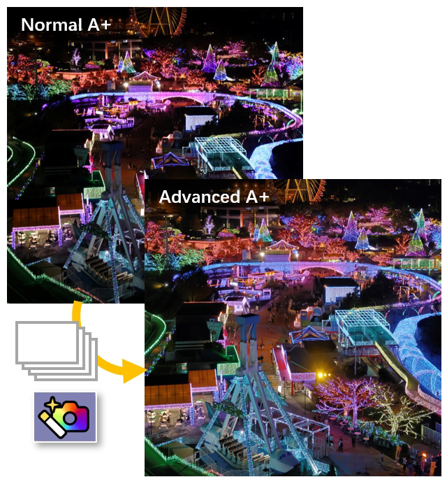 Advanced A+ mode automatically shoots and merges multiple images to give better results in scenes with tricky lighting.
