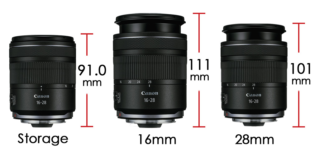 When fully retracted for storage, it is around the same compact size as standard zoom lenses like the RF28-70mm f/2.8 IS STM standard zoom lens and RF24-105mm f/4-7.1 IS STM kit lens. It is also noticeably smaller than the RF15-35mm f/2.8L IS USM, its professional grade counterpart.