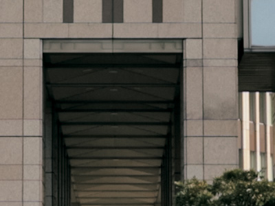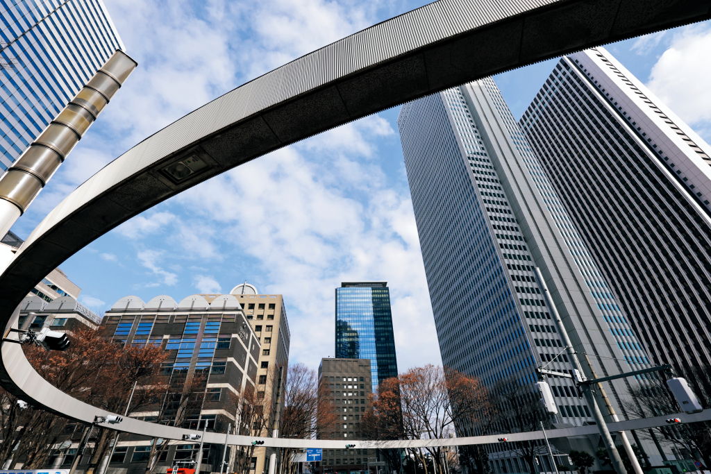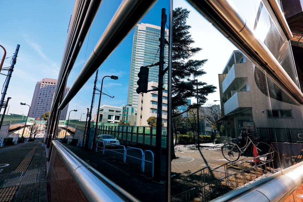 The scenes reflected in the glass panels are like parallel worlds. I tried different shooting heights and positions, seeking to create an image that draws attention to both the interesting shapes and the sense of perspective. Stopping down to f/5.6 kept the overall sharpness.