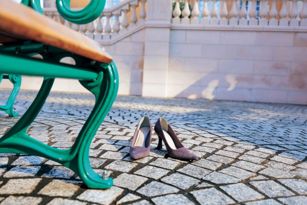 I chanced upon this pair of high heels, taken off and left next to a street bench for some unknown reason. Zooming in to 28mm to avoid obvious perspective distortion, I found a composition that conveyed the situation. I opened up the aperture to f/2.8 to blur out the background.