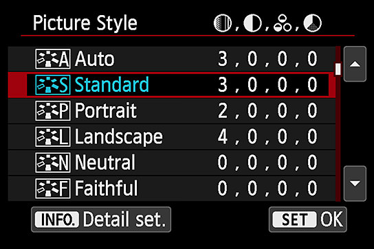 Select the Picture Style and press "INFO" to proceed to the Detail Setting screen.