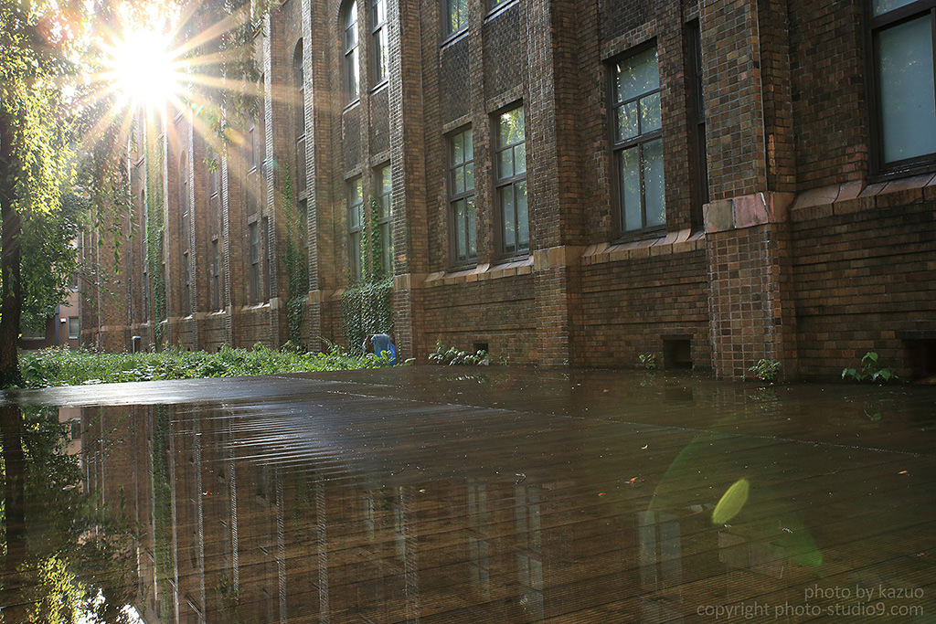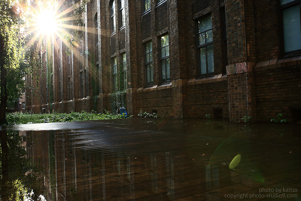 I changed the contrast and used negative exposure compensation to create well defined contrasts within a sombre atmosphere. By making the walls of the building and the wet ground darker, the contrast with the sun was effectively expressed.
