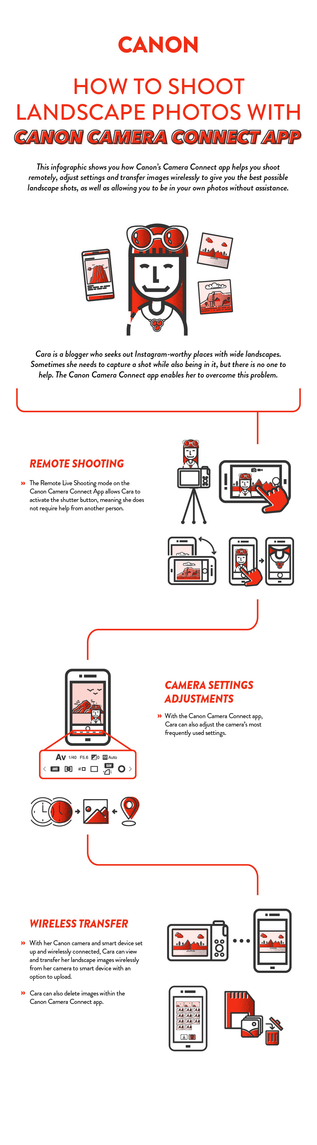 If you shoot landscape photos with you featured in the shot, you need someone to take the photo. Let this infographic show you how Canon’s feature-packed Camera Connect app helps you shoot remotely, adjust settings and transfer images wirelessly to give you the best possible landscape shots, as well as allowing you to be in your own photos without requiring help.