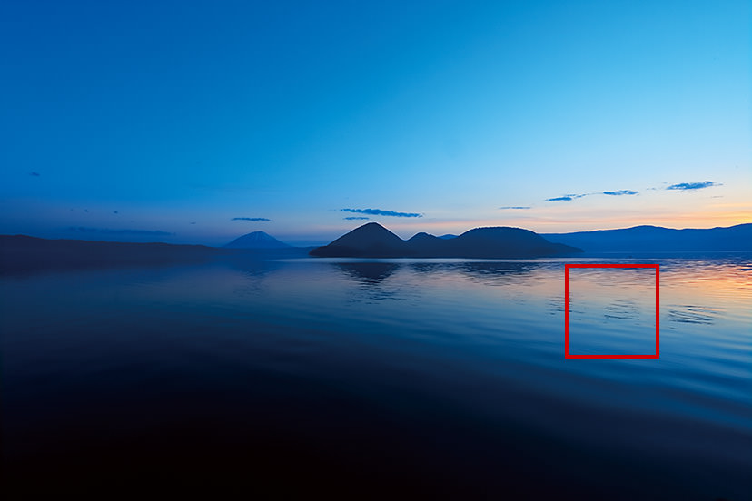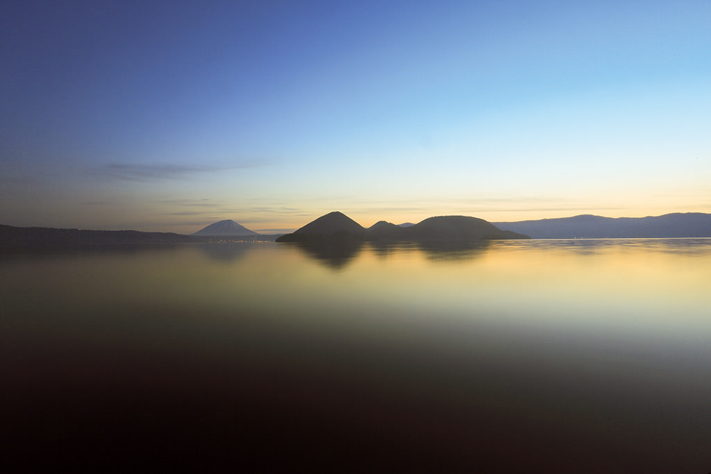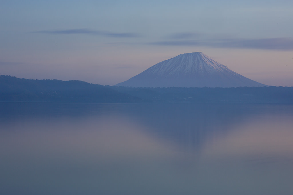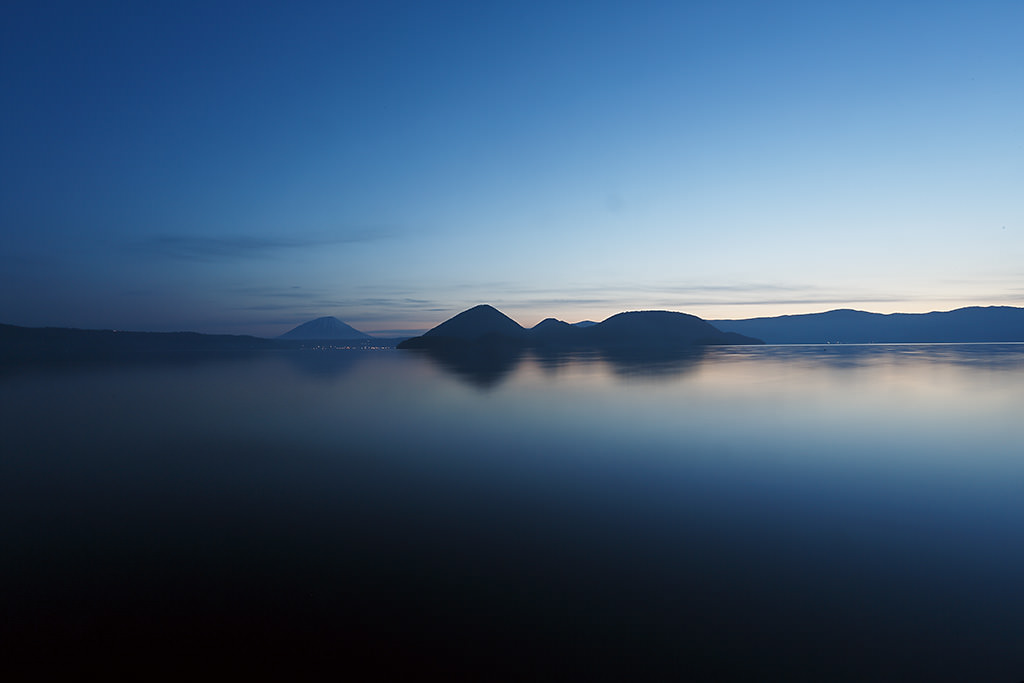 Lake Toya, Hokkaido in mid-May. The surface of the lake is depicted smoothly with a slow shutter as if the world bathed in blue extends to the surface of the lake as well. With the horizontal in mind, I decided to use a symmetrical composition .