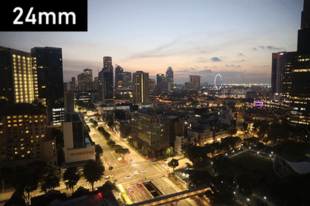 A shorter focal length (such as 24mm) provides a wider angle of view. That means more of the scene is captured in the frame. For example, a focal length of 24mm on a full-frame camera captures an 84° view of the scene. Objects will appear smaller in the frame.