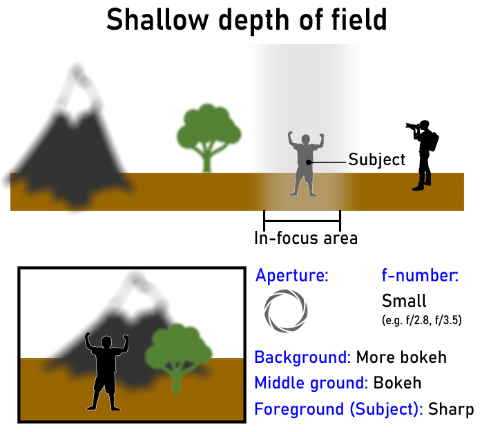 - Smaller f-number (wider aperture) = shallower depth of field, more bokeh