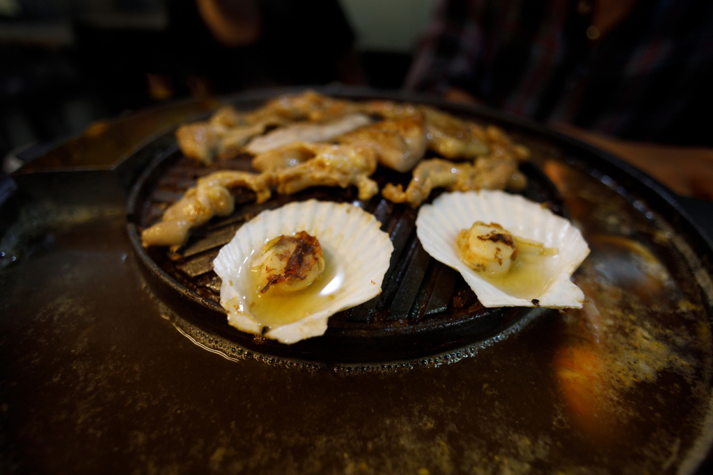 The shells cooking in front look very large compared to the meat behind. A great way to draw attention to food as long as the distorted shapes are not an issue!