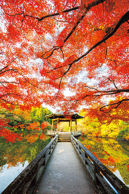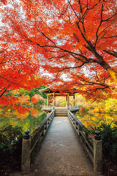 When I composed this shot, I paid attention to the balance between the autumn leaves and the floating pavilion, as well as how the branches of the trees were pointing. I got the best results at 15mm. The wide-angle perspective effect on the branches and the path guides our eyes towards the floating pavilion.