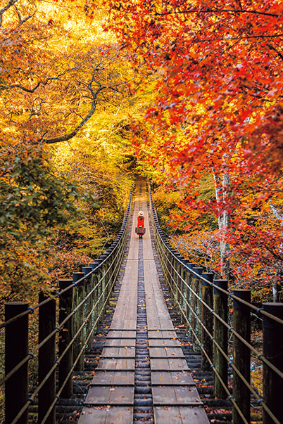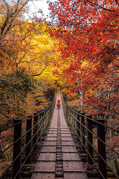 I shot with the camera below eye level to exclude the sky from the frame. This focuses the viewer’s attention on the suspension bridge and autumn leaves.