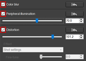 When the box next to ‘Digital Lens Optimizer’ is checked, the items for ‘Diffraction correction’ and ‘Chromatic aberration’ become unavailable. However, for best results, make sure that ‘Color blur’, ‘Peripheral illumination’, and ‘Distortion’ are checked, too. You can adjust the effect level for ‘Peripheral illumination’ and ‘Distortion’.