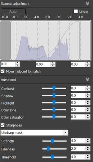 This also applies to when you make fine adjustments to shadows and highlights via ‘Shadow’ and ‘Highlight’ sliders or the gamma adjustment curve in the ’Basic adjustments’ tab, or to the tone curves in the ‘Adjust image tone curves’ tab.