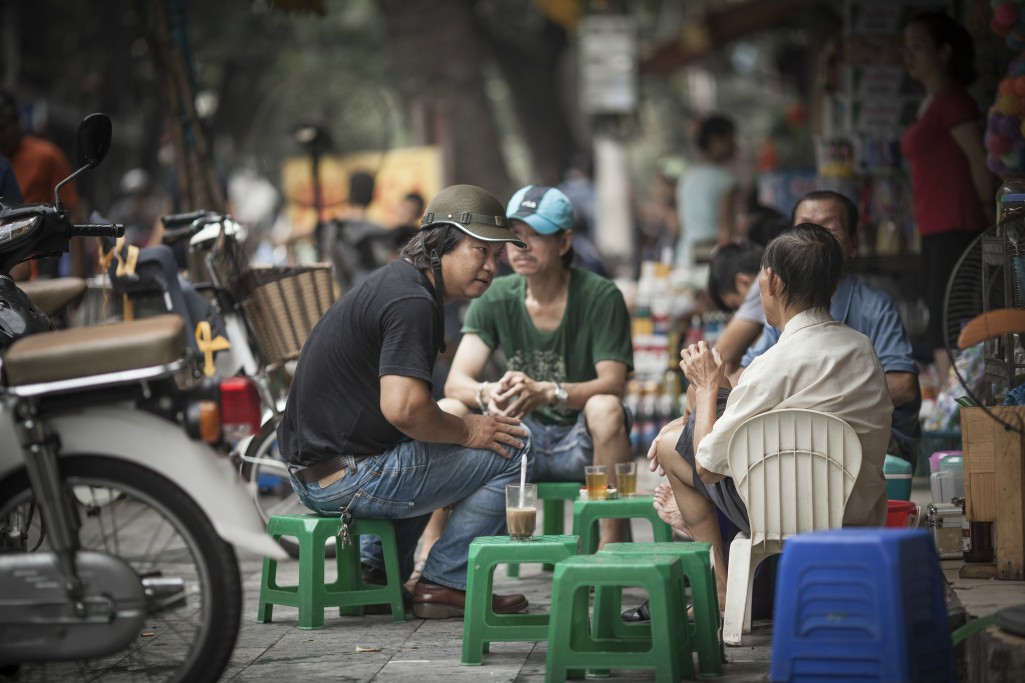 Locals drinking tea and coffee on a street in Hanoi