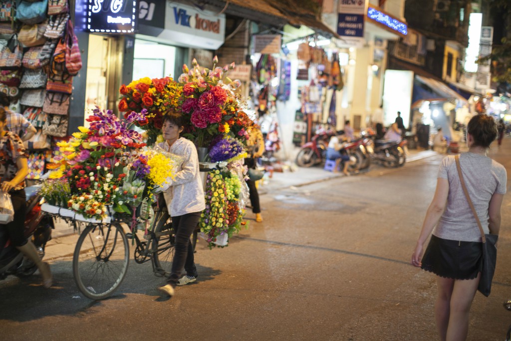 Flower seller plying her trade on a street in Hanoi