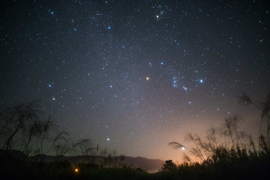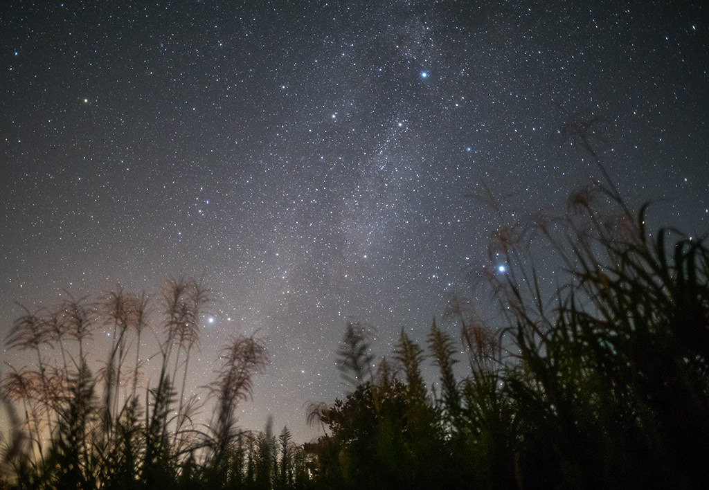 While I was moving around shooting in an expansive field of Japanese pampas grass by the riverbed, Orion rose in the eastern sky. I took shots with the camera mounted on a tripod while limiting the shutter speed to 8 sec. This allowed me to use an ISO speed of ISO 3200 at a maximum aperture of f/1.4 with peace of mind.