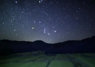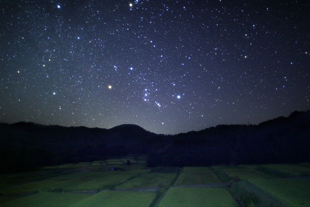 I came across an impressive scene in which Orion rose in the eastern sky above the rice fields in a mountain village. The conditions were extremely dark, requiring an exposure of 30 seconds even at f/1.4 and ISO 3200. This emphasized the radiance of the stars and the details of the nearby landscape.