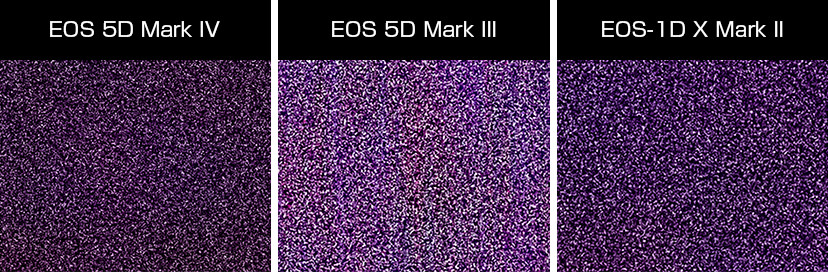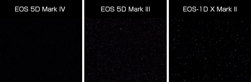 A comparison of only the dark current noise was carried out in a completely dark room. The exposure was set to 30 sec for all cameras, and at an ambient temperature of 25°C, with the number of pixels becoming uniform on the EOS 5D Mark IV after the shoot. The images were enlarged to 200% and highlighted. At ISO 3200, white pixels are almost non-existent in the image taken using the EOS 5D Mark IV.