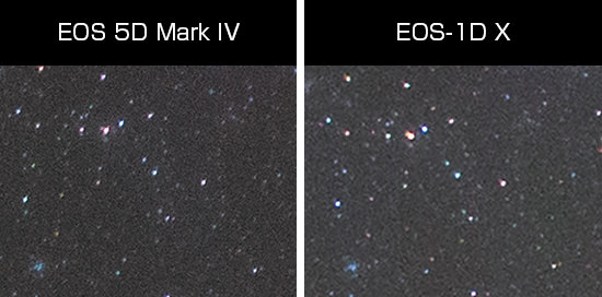 I compared an image of stars taken on the EOS 5D Mark IV with one taken on the EOS-1D X, which has a slightly larger pixel size. Using the same data from the same location, I enlarged the images by 600% so that the number of pixels was uniform for both images. Although the difference is minor, it is apparent that false colours occur in the image of stars taken using the EOS-1D X.