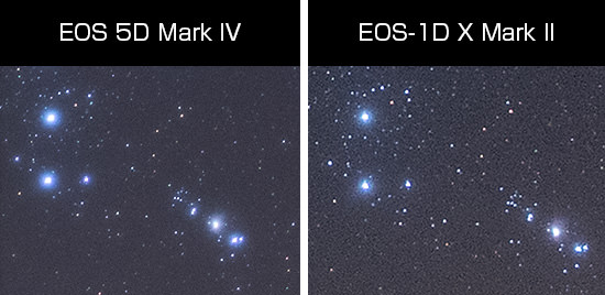 I enlarged the images of the 3 stars of Orion to make them the same size. In the image taken using the EOS-1D X Mark II, the dark stars appear enlarged. However, in the image taken using the EOS 5D Mark IV, you can see that the differences in the brightness of the stars are expressed considerably more accurately.