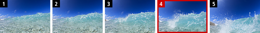 On the EOS 5D Mark IV, continuous shooting is possible at 7 frames per second (fps) and at an image resolution of approximately 30.4 megapixels. This allows you to obtain clear and beautiful shots even of fast-moving objects, such as this one of a wave, right down to the spray.