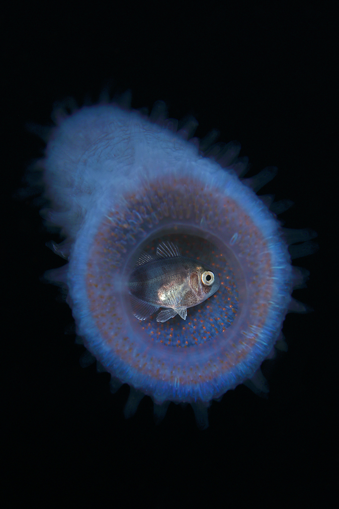 Photo credit: Steven Ko (Taiwan). This floating Pyrosoma became a frame for a larva fish that sought protection within.