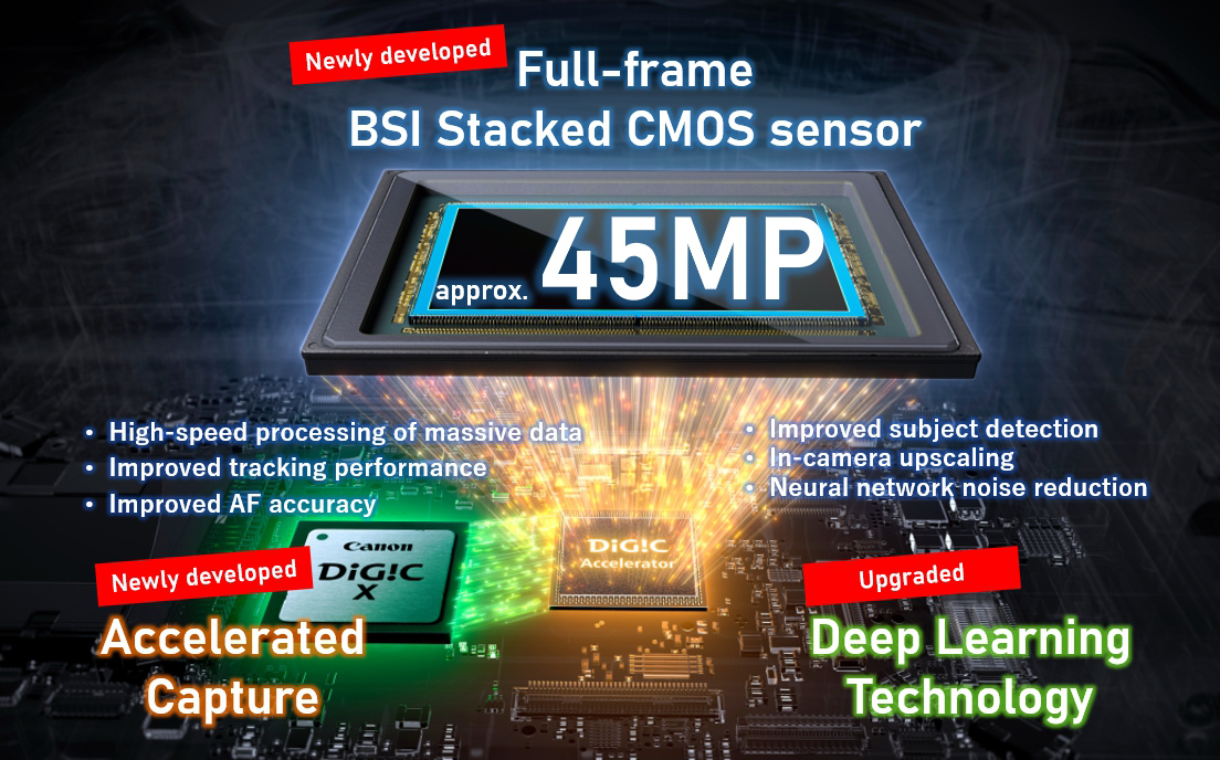 As more processing power is necessary to process the faster, larger data output from the new BSI stacked CMOS sensor, Canon developed the new DIGIC Accelerator, which can perform the computing required for functions like autofocusing (AF) and auto exposure (AE) instantaneously. It is combined with the DIGIC X image processing engine to form the new Accelerated Capture system, which enables the 45 megapixels’ worth of information from the EOS R5 Mark II’s image sensor to be processed at least as fast as the 24.1-megapixel EOS R3.