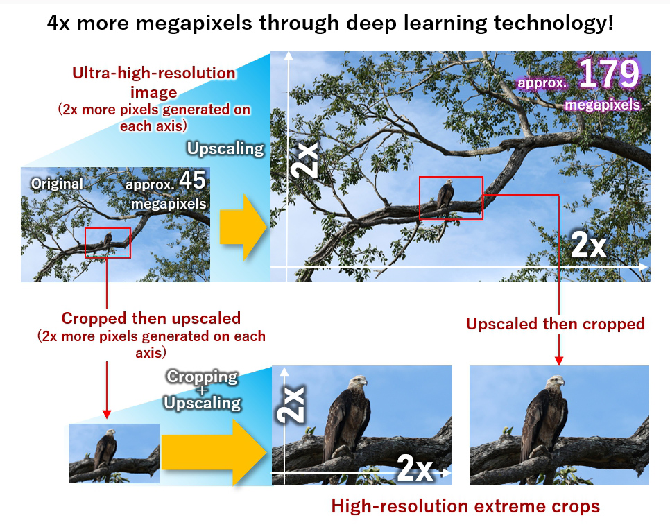 - The In-camera Upscaling tool quadruples the number of pixels in each image to generate ultra-high-resolution 179-megapixel images