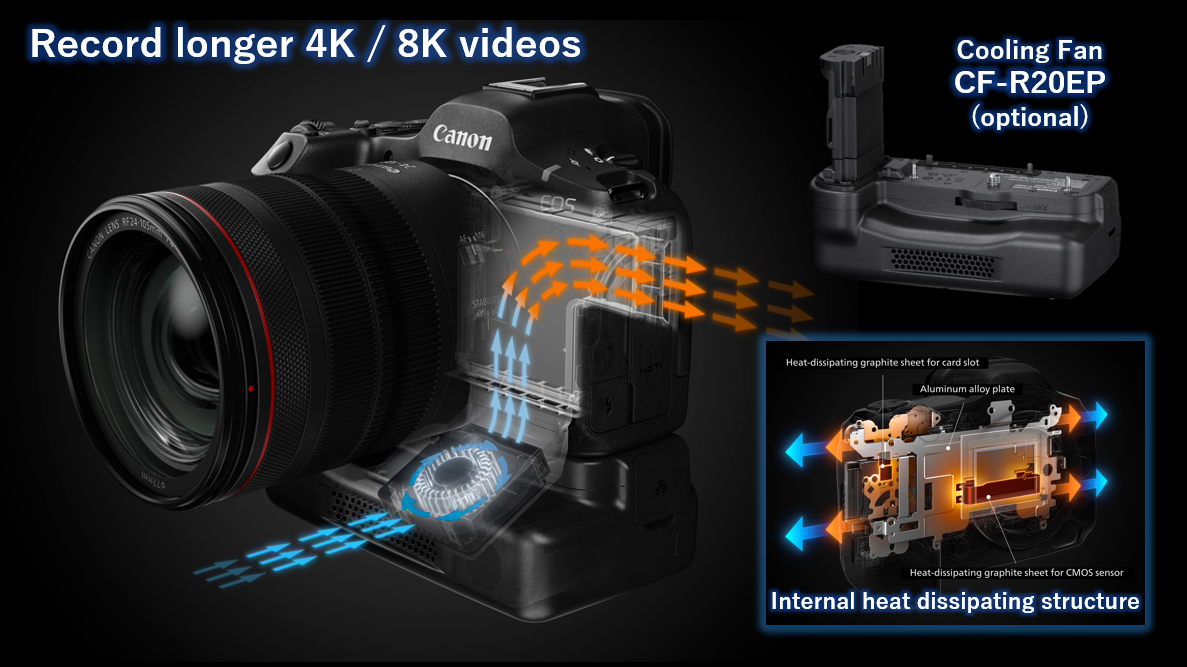 Users who require even longer video recording durations can purchase the Cooling Fan CF-R20EP, a cooling fan accessory that dissipates internal heat, supplies extra power, and provides an Ethernet port for additional high-speed data communication capabilities.