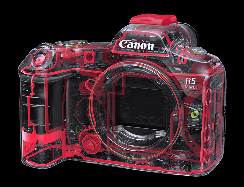 The EOS R5 Mark II is also equipped with an improved internal heat-dissipating structure, which uses a graphite sheet and aluminium plate to disperse heat from the sensor to the exterior, allowing users to shoot for longer durations.