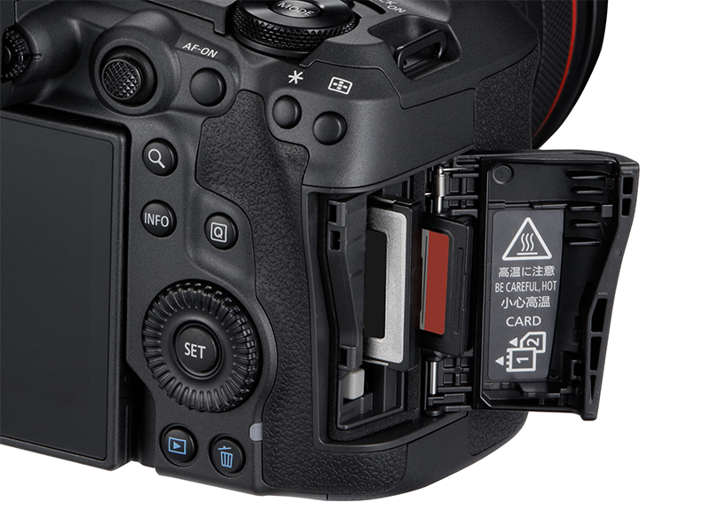 The camera is equipped with one CFexpress card slot* and one SD card slot**.
