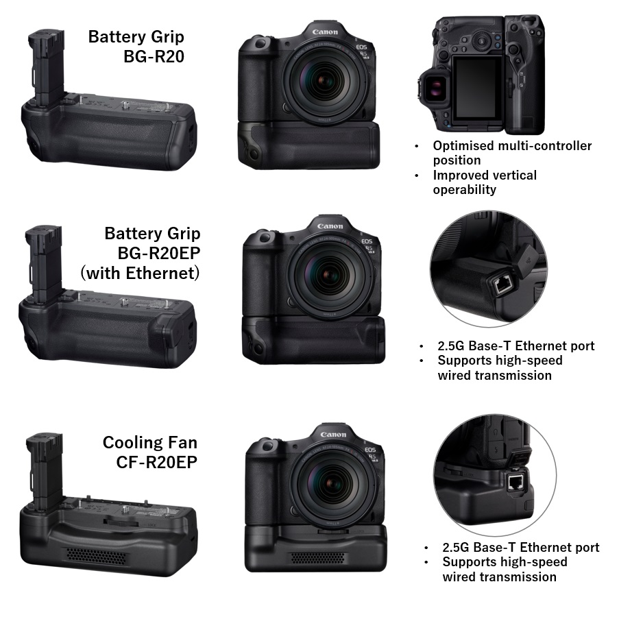 Battery Grip BG-R20EP and Cooling Fan CF-R20EP are both equipped with 2.5G Base-T compatible LAN ports, which will speed up the transfer of large video and image files through a wired internet connection.
