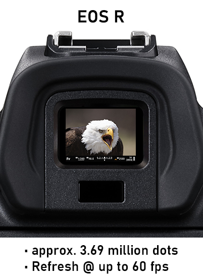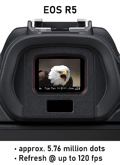 While the electronic viewfinders (EVFs) of the EOS R and EOS R5 are essentially the same size, the one on the EOS R5 has about 50% higher definition than that on the EOS R, resulting in a display that looks so smooth, you will barely be able to see the individual viewfinder pixels.