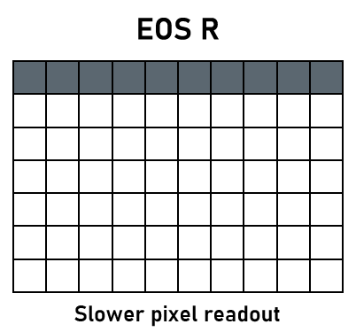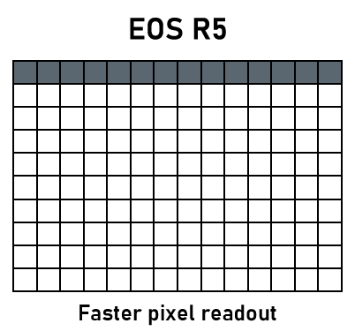 During an electronic shutter exposure (‘Silent Shutter; mode on the EOS R), the lag between the time the topmost and bottommost row of pixels on the image sensor are read can cause distortions in images of moving objects—a phenomenon known as ‘rolling shutter’. However, on the EOS R5, the image sensor readout speed is significantly faster, which means that rolling shutter is less pronounced.