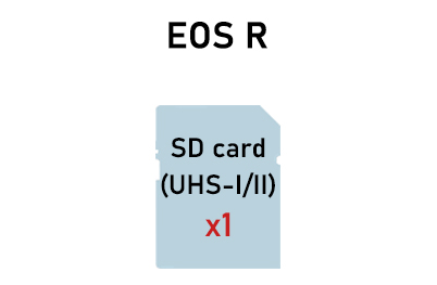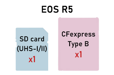 Dual card slots provide additional reliability: you can use one of them to auto-backup your image files. The EOS R5 has one slot that supports the widely available SD card (UHS-I/UHS-II), and another slot that supports a CFexpress Type B card, which enables significantly faster reading and writing speeds. CFexpress Type B cards are also more durable with better heat-dissipating qualities!