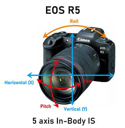 The EOS R5 is equipped with a sensor-shift In-Body Image Stabilizer (In-Body IS), which detects the level of blurring from camera shake using information from the image sensor, gyro sensor, and acceleration sensor in the camera, and then shifts the image sensor accordingly to perform 5-axis image stabilisation in the horizontal, vertical, roll, yaw, and pitch directions, providing up to eight shutter speed stops’ equivalent camera shake correction with compatible lenses.