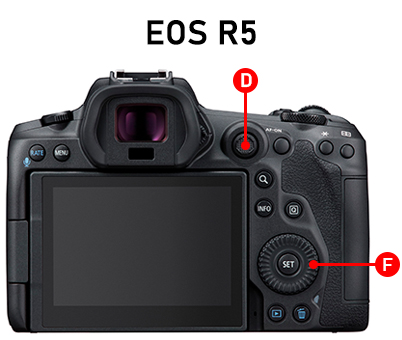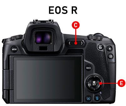 The EOS R5 is better equipped for control even when capturing fleeting moments. The multi-function bar (C), a major distinguishing feature on the EOS R, is replaced by the more intuitive multi-controller (D) on the EOS R5, allowing convenient selection of AF points. The cross keys (E) on the EOS R are replaced by a Quick Control Dial (F) for faster setting changes.