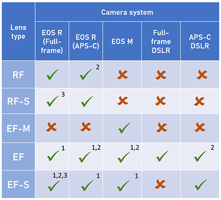The chart below shows the cross-compatibility between the different types of lenses and camera bodies: