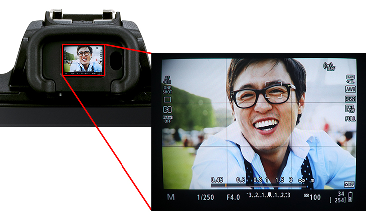 The optical viewfinder (OVF) on DSLRs shows the image direct from the lens reflected in the mirror. Meanwhile, the display on an EVF has gone through the image processor just like the Live View display on the LCD screen. This makes it possible to display more information and preview the effects of your exposure, white balance, or colour settings.