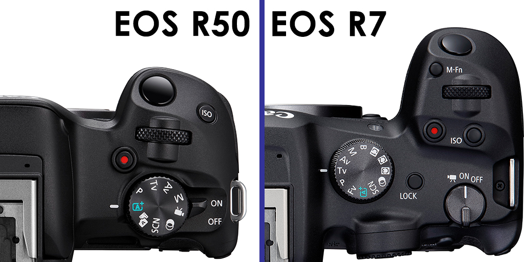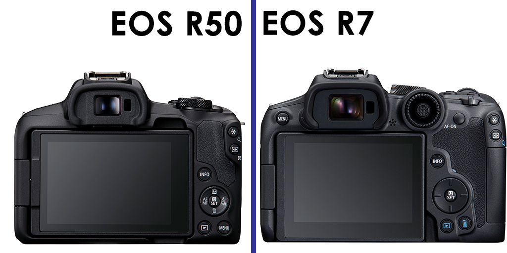 The images below show the top right and back panel controls of the EOS R50, an entry level APS-C camera, and the EOS R7, Canon’s top of the line APS-C camera model.