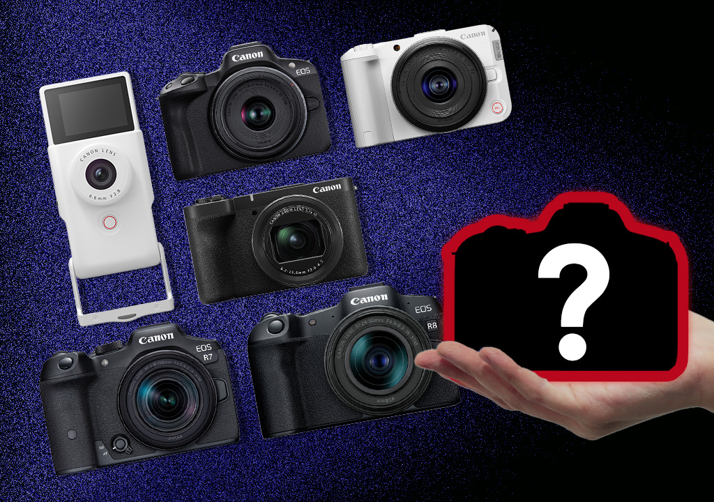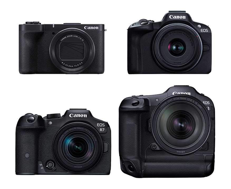 Clockwise from top left: PowerShot V1, EOS R50, EOS R7, EOS R3. Budget aside, these cameras of different sizes and form factors would appeal to very different users.